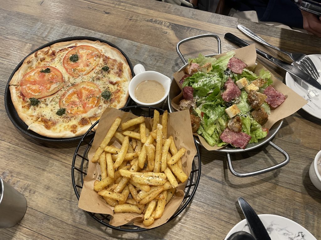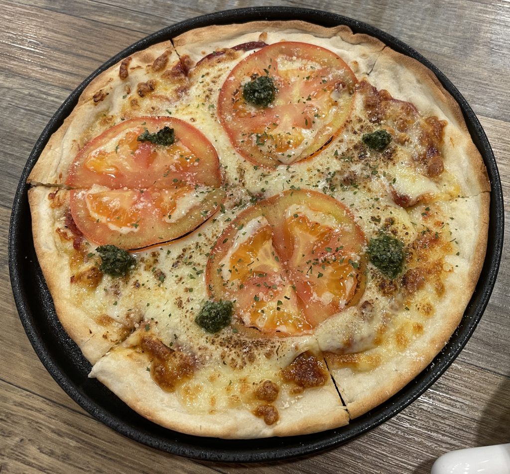 The second dish was a cheese and vegetable pizza. It had a light flavor, with a strong tomato sauce taste that I really enjoyed. It was also bigger than I expected, which was satisfying.