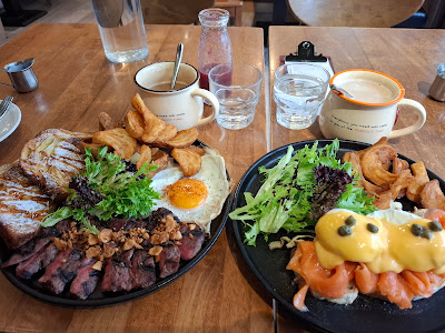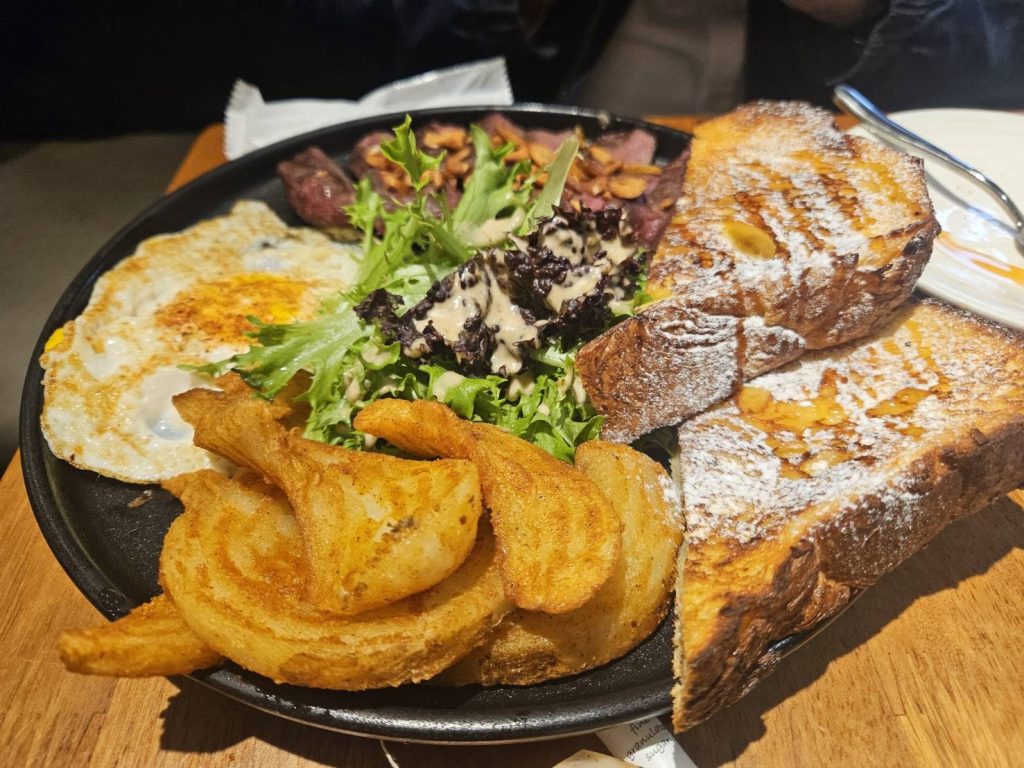 The thickly toasted bread is delicious. The item next to it is brown sugar butter.