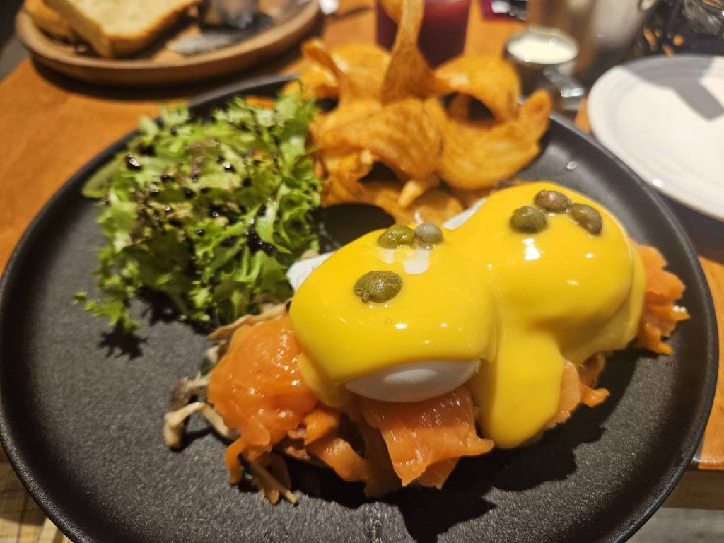 It features salmon, a soft-boiled egg, and cheese on top of the bread.